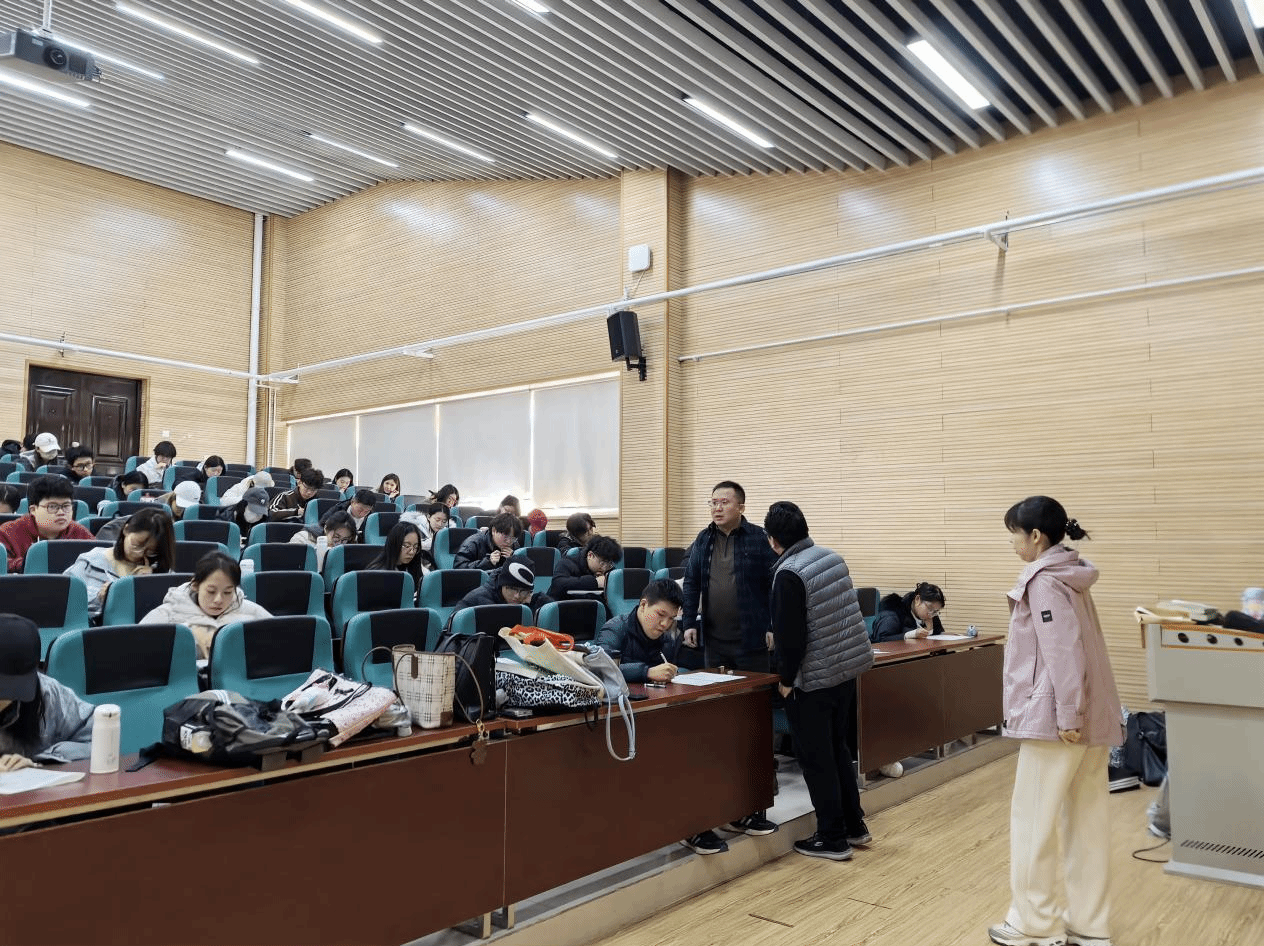 本次检查覆盖了学院多个考试场次。检查过程中,教学院长王年文亲自带队,深入考试现场,对考场秩序、监考教师履职情况及学生遵守考试纪律情况进行了细致巡查。从检查的整体情况来看,各考场准备充分,环境整洁;监考教师准时到岗,认真负责,严格执行考场规则;绝大多数学生自觉遵守考试纪律,专心作答,展现了良好的精神风貌和诚信意识。检查组成员对发现的个别细节问题,如个别学生证件放置不规范等,进行了现场提醒与指导。