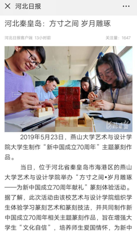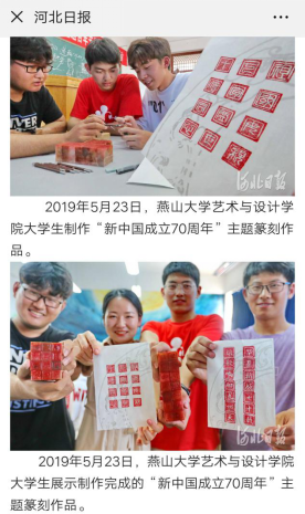 为增强大学生“文化自信”,培养师生爱国情怀,组织学生体验学习篆刻艺术和篆刻技法,并共同制作新中国成立70周年相关主题篆刻作品。5月26日,河北日报客户端以“方寸之间·岁月雕琢”报道此次活动。