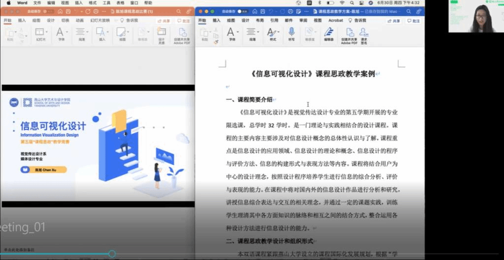 视觉传达设计系蒋玉主任以《传统美学《美的历程》》课程为例、常鑫老师以《品牌形象系统设计》课程为例、陈旭老师以《信息可视化设计》课程为例,分别围绕课程思政教学设计进行了介绍与展示,从课程简要介绍、课程思政教学设计和组织形式、课程思政内容和体现形式、教学方法、教学过程和教学反思五个方面展开说课。