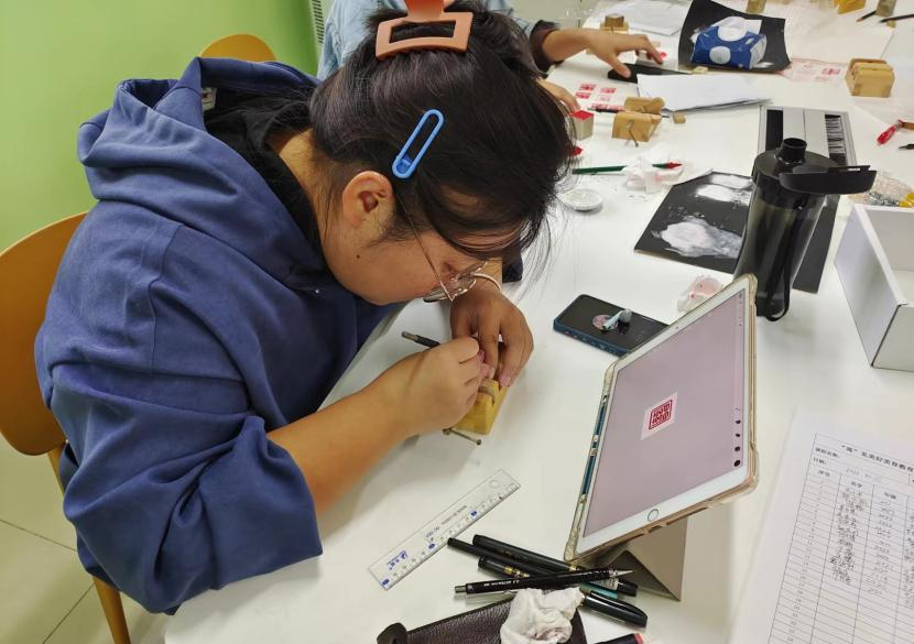 4月9日,在“篆刻实操2”体验课堂上,负责人通过认真讲解篆刻基础知识并进行实操示范,加深了初学体验者对篆刻艺术的认识,帮助同学们领略了“方寸之间、气象万千”的意趣。引导同学们深入的了解了篆刻艺术所代表的中华传统“真、善、美、信、达、雅”的智慧真谛,唤醒了同学们对中华优秀传统文化的关注。