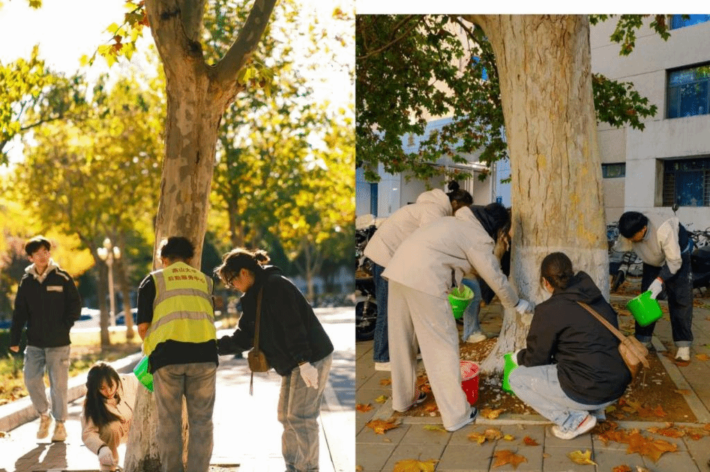 活动现场,后勤服务中心的老师傅们对树林的品类逐一介绍、对相关养护知识详细讲解,认真指导学生们如何操作,每个步骤的注意事项。同学们戴上手套、拿起工具,找到自己的“责任树”,兴致勃勃行动起来。同学们在老师傅们的指导下,不知不觉间,一棵又一棵树木被养护,同学干的热火朝天。一路而下,校园主干路段的树木粉刷一新。当一排排大树粉刷养护后,同学们纷纷转身回望,成就感油然而生。