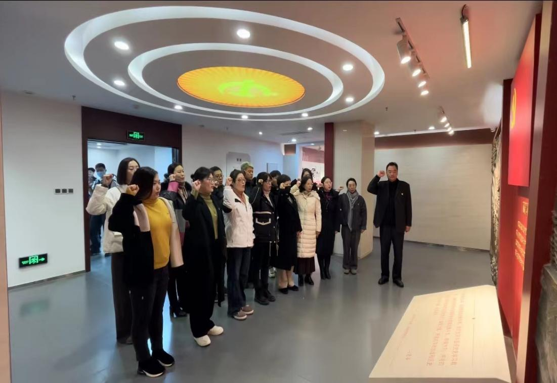 在党员组织生活馆的宣誓大厅,全体党员干部面对中国共产党党旗,在院党委书记张文超的领誓下,一起重温入党誓词。