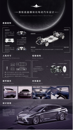 该产品采用了一种将电动汽车滑板底盘分为前中后三部分的模式,其中前部与中部在左右两边各设有两个竖排放置的伸缩杆结构,通过伸缩使底盘前部与中部的距离发生改变,从而达到调节轴距的效果,同时又可以避免与动力装置干涉。这种结构能够极大程度释放空间,让造型有了更多可能。适合调节轴距的上下解耦的滑板底盘布置模式,旨在突破传统的汽车研发方式与用户自定义形式,为汽车制造企业提高研发效率,为造型与功能释放空间,为消费者的出行提供更多的可能性。