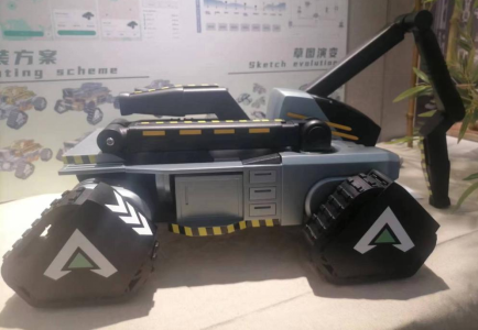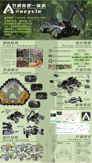 该设计适用于各种地型下,人工竹林竹根遗留清理作业。在对竹资源规模化种植下,通过对遗留竹根的处理以及再应用,加快新竹的再生。这款设计造型以正方体体块为主,凸显出设备的沉稳与厚重;设备以破碎竹根并喷洒试剂的方式进行作业,加快了竹根育肥的同时解决竹根残留问题;工作端以机械臂连接的方式进行作业,多根机械臂共同作业实现设备的模块化工作;轮胎采用履带轮并增加可调节高低的传动轴,解决不同地形的问题;设备采用无人工作,减少了对人力资源的消耗。
