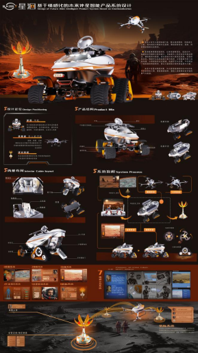 本设计针对火星探险者的全面需求,整合星洄载具、寻星者无人机、逐光信标及情感交互系统。星洄载具搭载星图系统,记录驾驶者信息,促进合作,同时确保生命维持与移动能力。寻星者无人机灵活应对复杂情况,辅助勘测与救援。逐光信标传达火星地区信息,实现信息共享。情感交互系统是本设计的亮点,它连接火星与地球,让探险者与家人保持日常沟通,分享心情与经历。无论是音乐播放、天气查看,还是相册浏览、通讯记录,都体现了对探险者情感需求的关注。设计注上重实用与情感并重,为火星探险者提供全方位的支持。它不仅是探险的工具,更是情感的纽带,让探险者在遥远的火星上感受到家的温暖与关爱,展现人类探索未知宇宙的勇气与智慧。