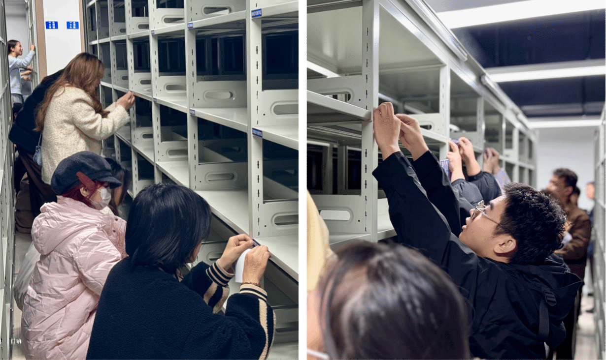 在图书馆老师的指导下,有序地进入密集书库。密集书库作为图书馆的重要存储区域,投入使用后将存放着大量的图书资料,但由于空间有限,图书的摆放和管理显得尤为重要。此次贴层架标活动,正是为了进一步优化书架层级关系和提高查找效率。