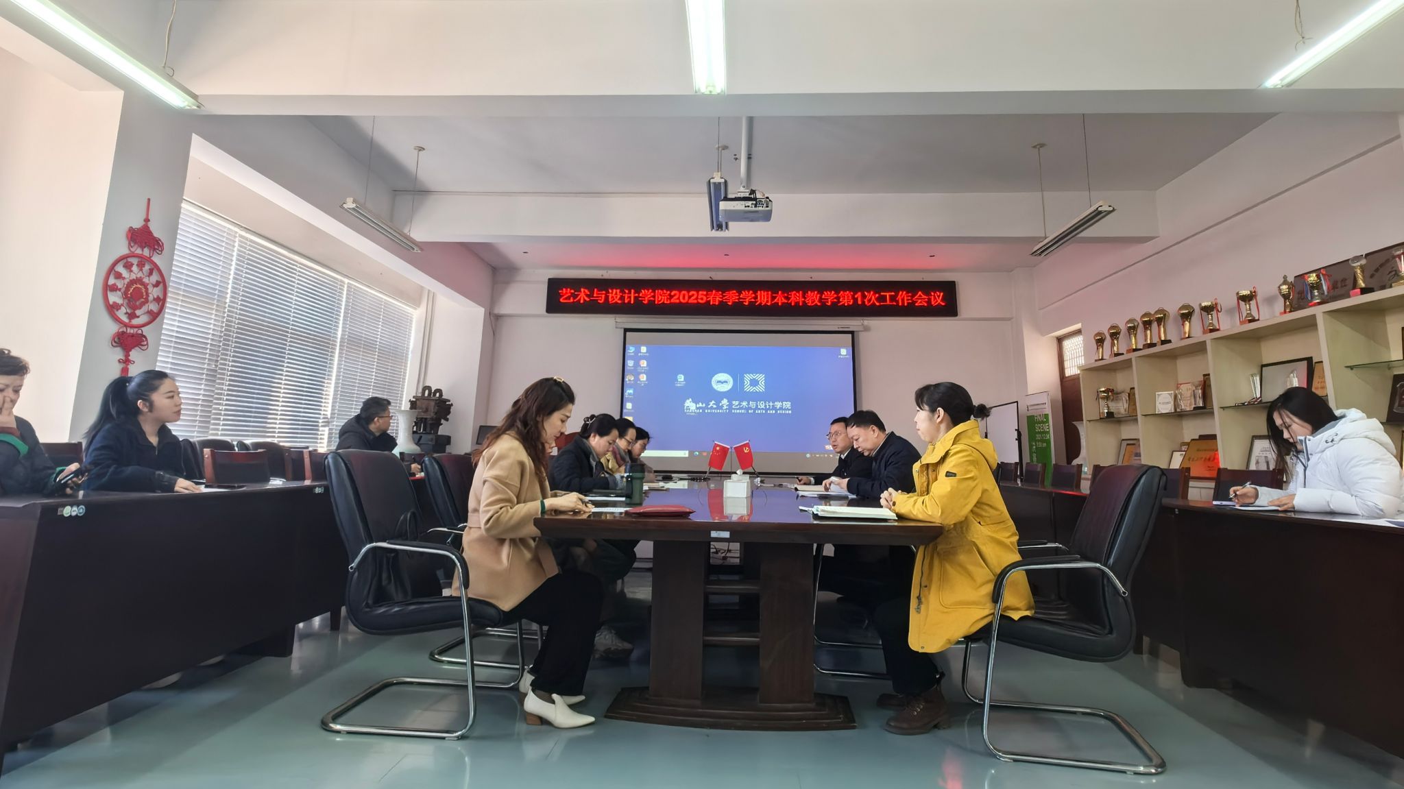 在美术馆C305会议室召开2025年春季学期第一次本科教育教学工作会,院长赵琳、副院长王年文、各系部主任、副主任和综合办公室相关人员参加,会议由副院长王年文主持。