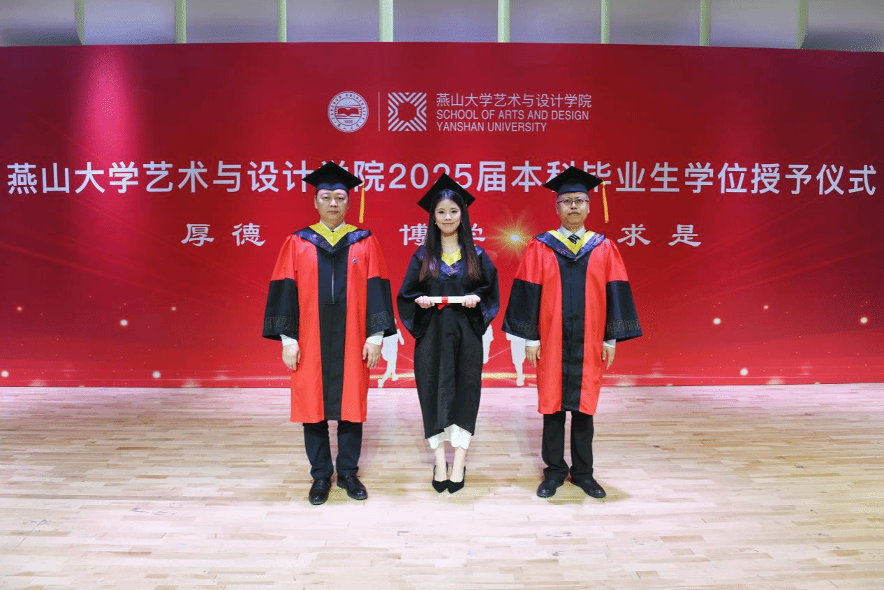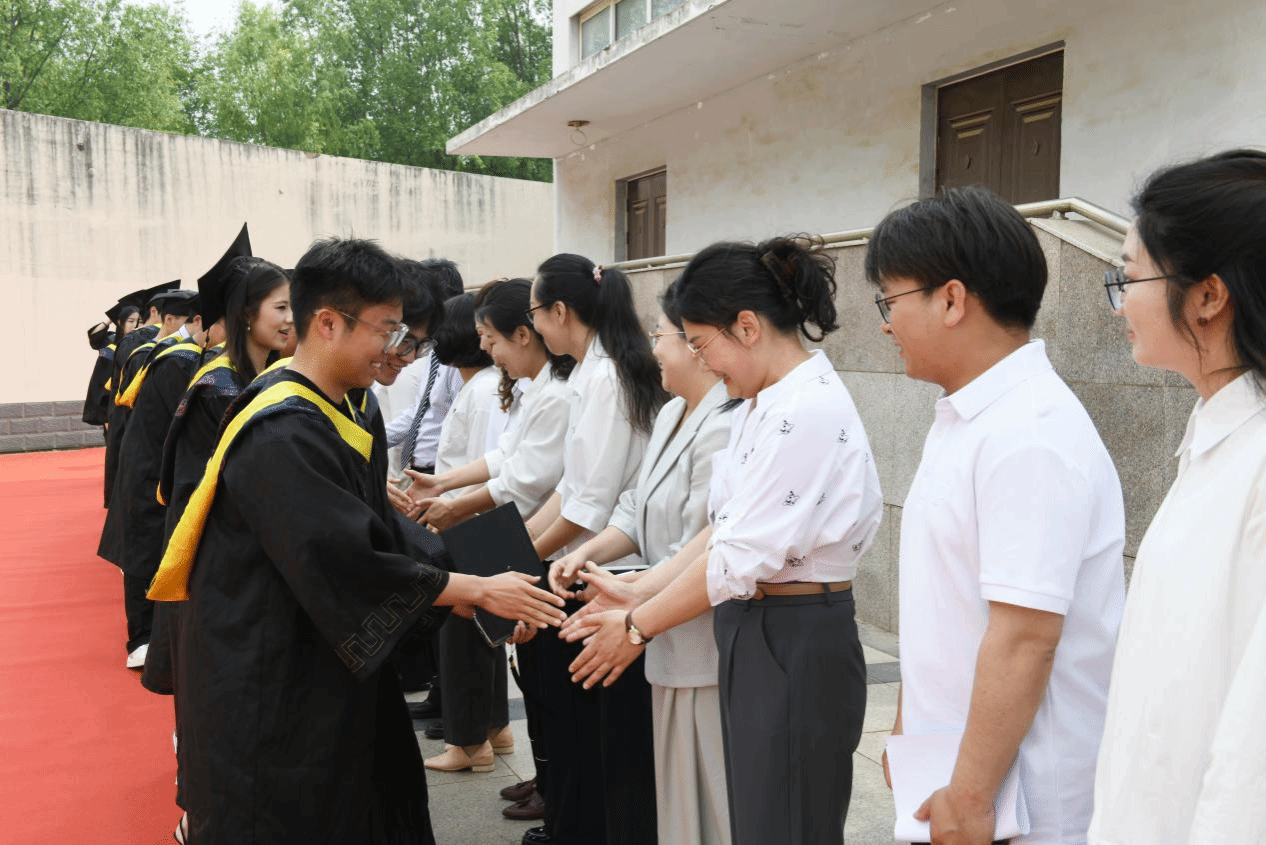 随后,在激昂的《大学生之歌》旋律中,学院院长赵琳及各系主任为每一位毕业生拨穗正冠并合影留念。毕业生们依次登台,向恩师鞠躬致谢,表达对学院培养的深深感激之情。