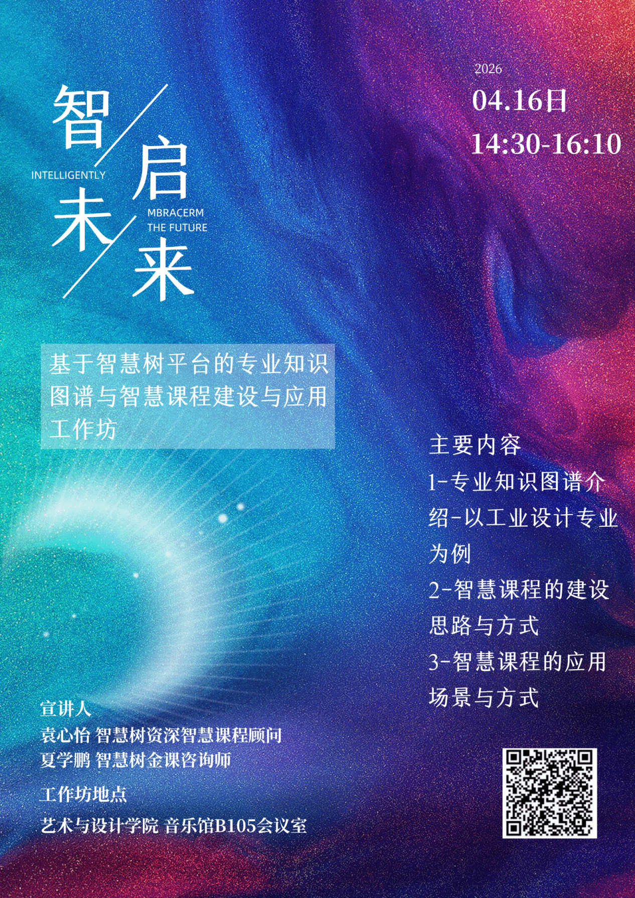 为深入贯彻落实国家教育数字化战略行动,推动人工智能与艺术设计教育的深度融合,探索智慧课程建设新路径,诚挚邀请各位老师参加智慧课程建设工作坊。