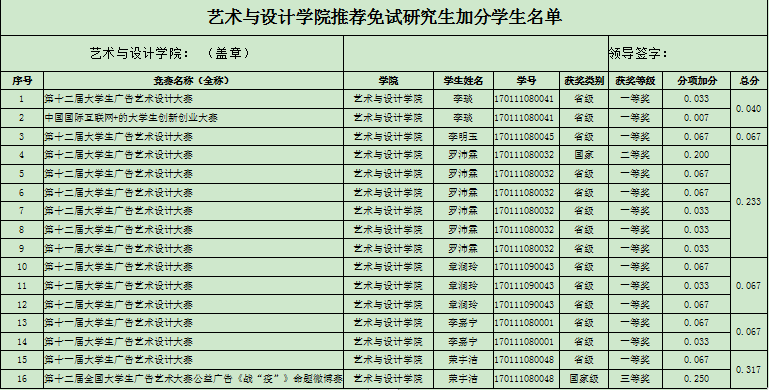 根据《探花视频 本科生创新创业竞赛组织与管理办法(2020年修订)》,在校本科生参加创新创业竞赛获奖,可根据竞赛类别及获奖级别,在推荐免试研究生所依据的原始绩点基础上,给予相应的绩点加分,现根据学生申报情况汇总,做如下结果公示: