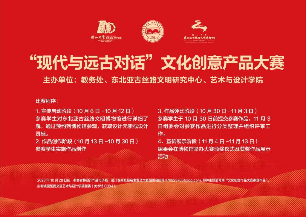 东北亚古丝路文明博物馆作为学校重要的文化阵地,开馆以来受到了广大师生的欢迎。为进一步探寻文物与文化创意的对接成果,用人文精神诠释校园文化品位,凝练特色文化品牌,浓厚的校园学创新氛围,提高师生学生的创新实践能力,为百年校庆增添文化气息。学校决定以东北亚古丝路文明博物馆馆藏文物为设计元素,举办 “现代与远古对话” 探花视频