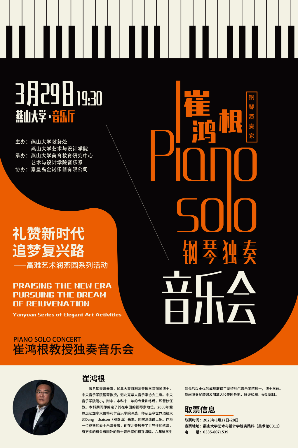 将举办“礼赞新时代,追梦复兴路”高雅艺术润燕园系列活动之崔鸿根钢琴独奏音乐会。