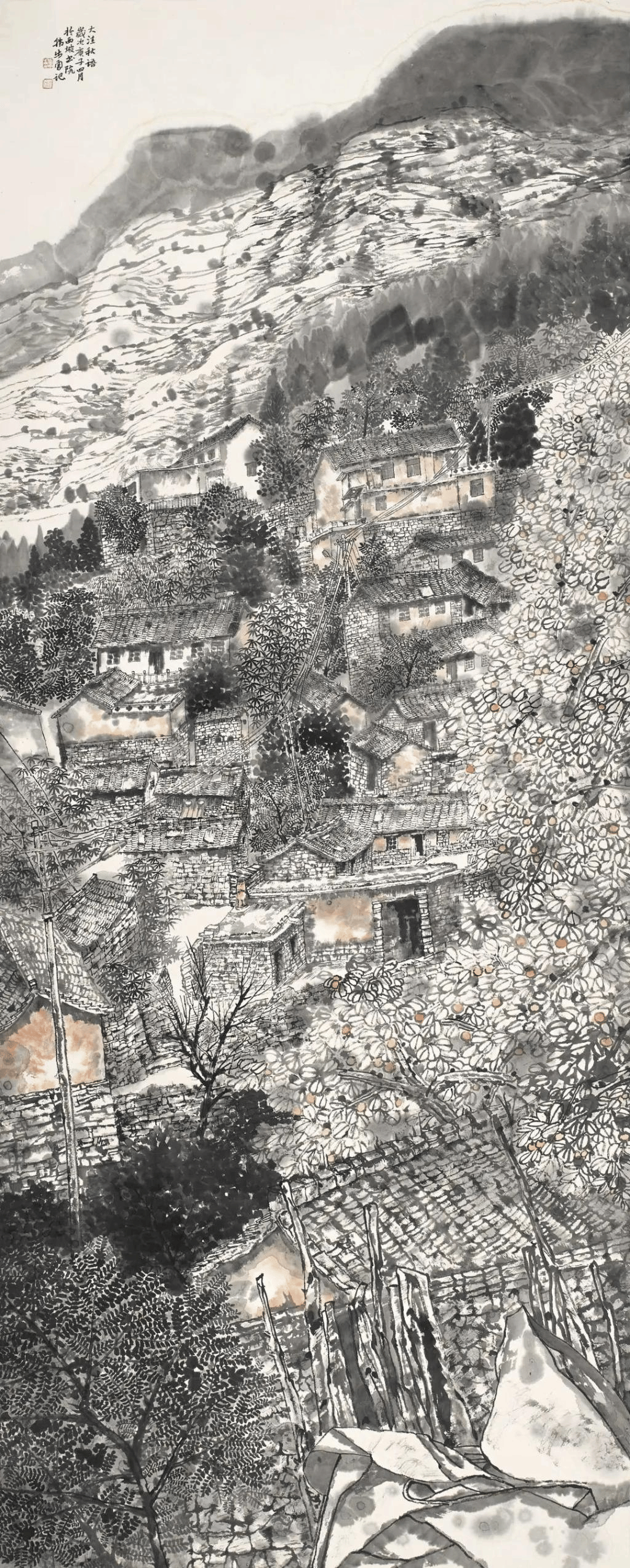 太行山对于韩步勇来说无疑是生命和艺术活具有重要意义的地方。作为在太行山怀抱中成长的画家,以太行山作为他的作品叙事内容,体现了他把绘画创作与自己的生活经验互为映照的创作理念,从而使作品呈现出自身生命信息的承载。他的作品以令人震撼的尺幅把太行山宏伟壮阔厚重雄浑的气象用一种纪念碑式的结构呈现出来,几何状的山体形块处理加强了视觉整体感,并由此来实现从写景到畅神的升华。另一方面,他在细部的刻画中却不厌其烦地把一草一木,一沟一畦,一房一舍这些充满生活气息和自然生机的景物进行具体而详实的表现,在细微之处呈现出太行山的亲切和生动的情境。在他的作品中,太行山既有一种令人高山仰止神魄,又有一种使人亲近的灵性。我想,这大概也是韩步勇在他的作品中希望传达给大家的感受吧。