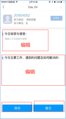 点击日报,周报,月报,即可看到每日每周每月的报告详情。点击任意详情(按钮12),可进行日报的编辑,编辑之后可以保存或者提交。(如忘记提交,编辑好内容后可以申请补交)