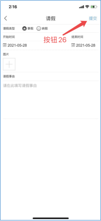 点击请假申请,即可看到请假申请的记录。点击请假(按钮25),进入编辑页面,填写请假类型,时间,图片,事由,然后点击提交(按钮26)。