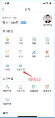 点击学生自评(按钮23)即可进行自我成绩评价(按钮24),评价后可自行撤销重新评价,根据后台管理员设置的成绩权重占比得出最终该模块成绩。