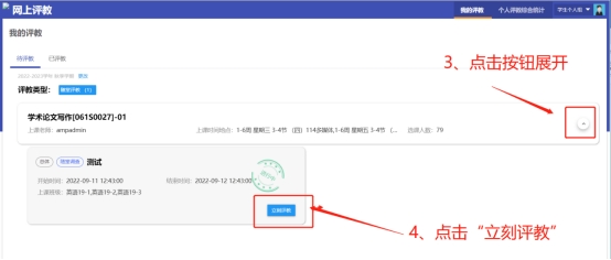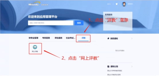 2、点击“评教”菜单,并进入“我的评教”即可进行问卷填写。配图如下