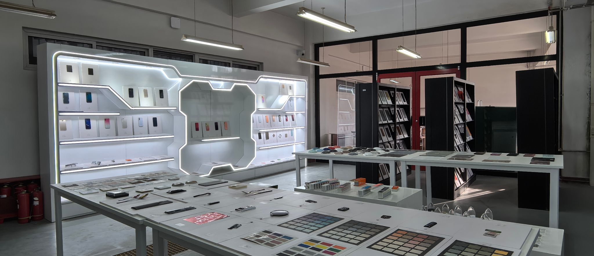 CMF实验室是探花视频 工业设计专业OBE教学实践基地,以“探花视频 卓越工业设计工程师”为培养目标,面向工业设计工程硕士研究生开展实践教学活动,总面积120平米。主要实践活动包括:色彩研究与流行色分析、材料创新研究与实验、表面处理技术双线库库构建与表面处理技法实践。
